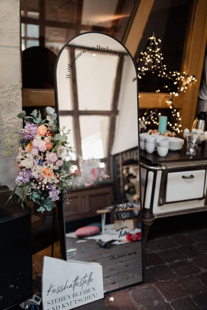Ein absolutes Must Have für die Braut war unser Spiegel Samira, der als Willkommensschild diente, und mit seinem Hinweisschild aus Stein, die Gäste liebevoll zum Knutschen aufgefordert hat. Wir dekorieren gerne mit Liebe zum Detail und freuen uns sehr, wenn ihr diese Details schätzt und liebt.