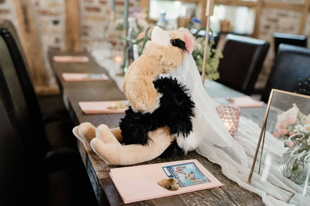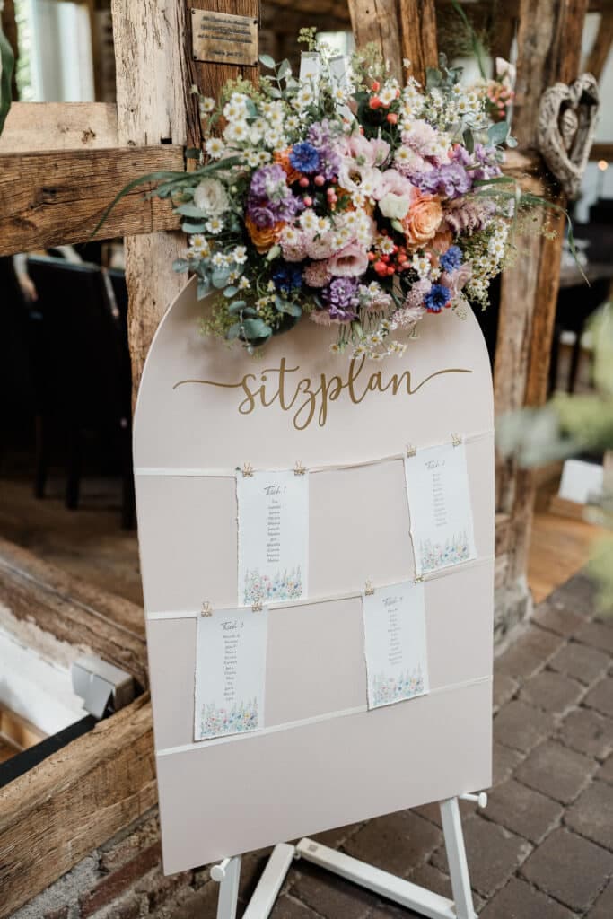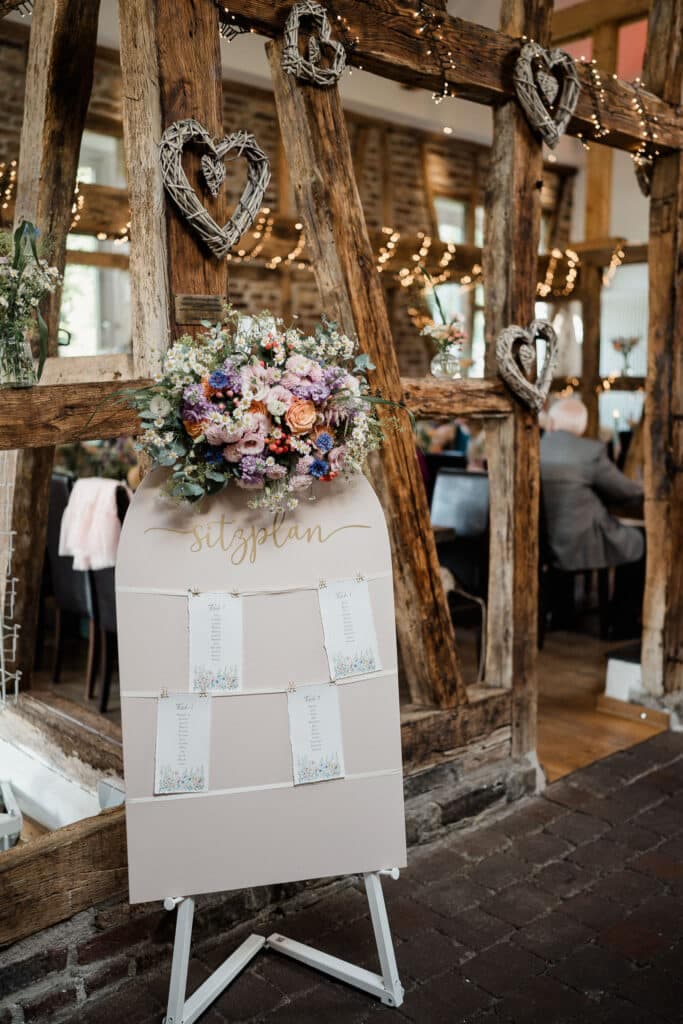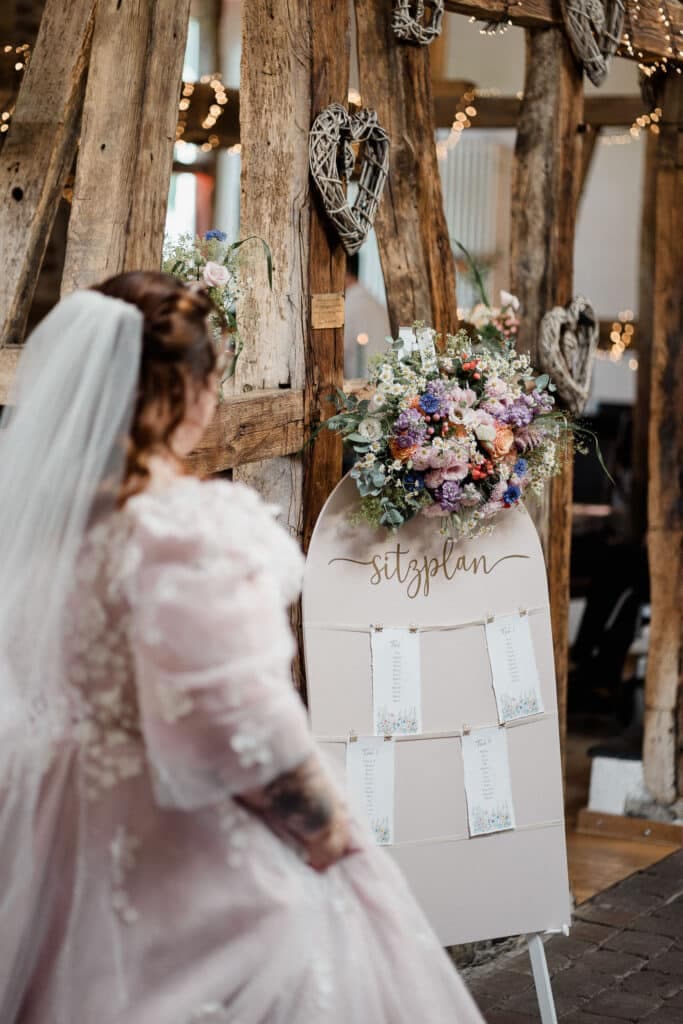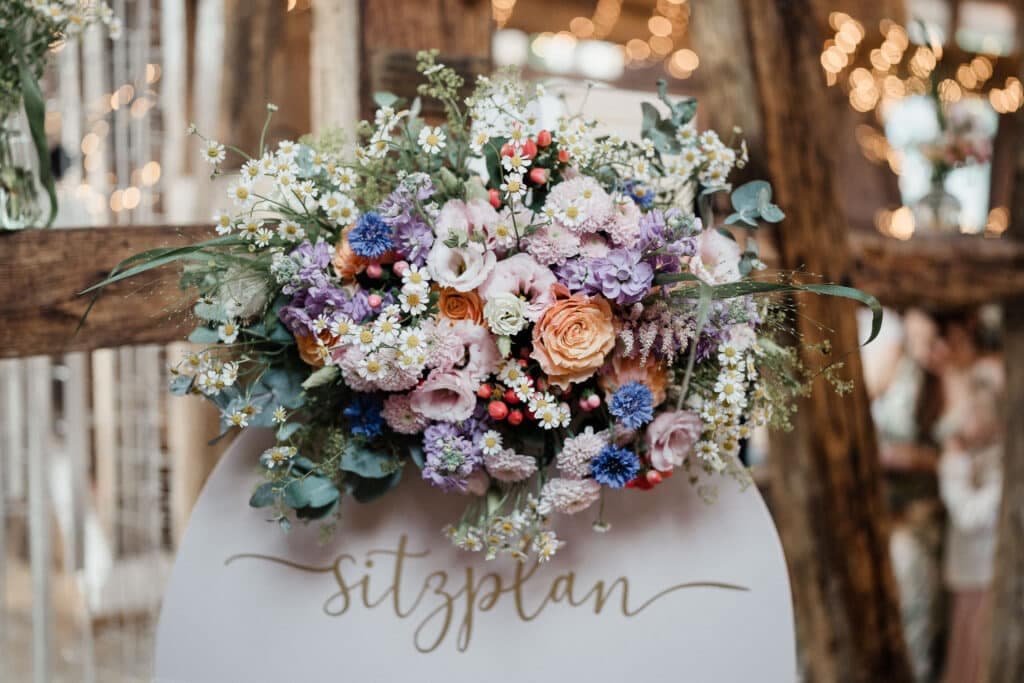 Eine rustikale Scheune muss nicht immer mit natürlichen Farben - wie beige, braun, grün - dekoriert werden. Hier darf es auch bunt und fröhlich werden. Genau diesem Wunsch sind wir nachgekommen und haben zum Beispiel als Sitzplan unseren rosé farbenden Samir mit einem tollen bunten Gesteck platziert.