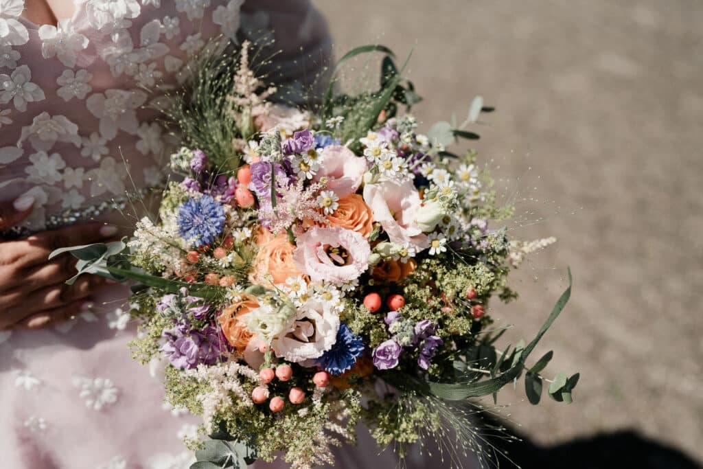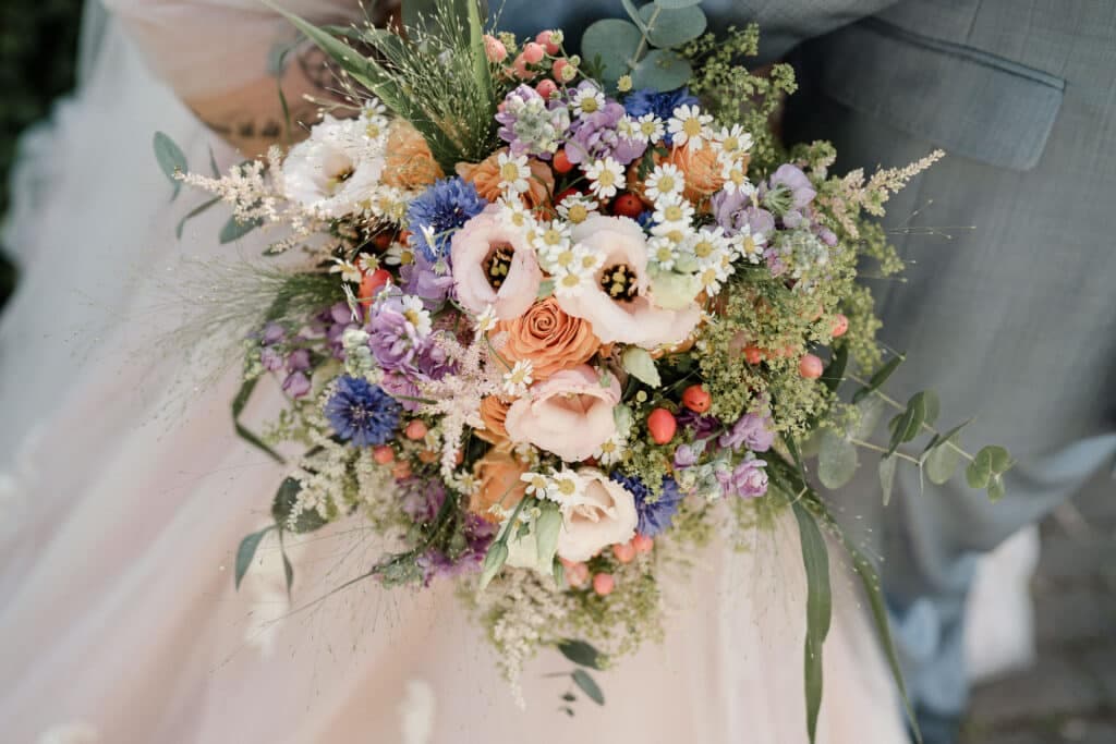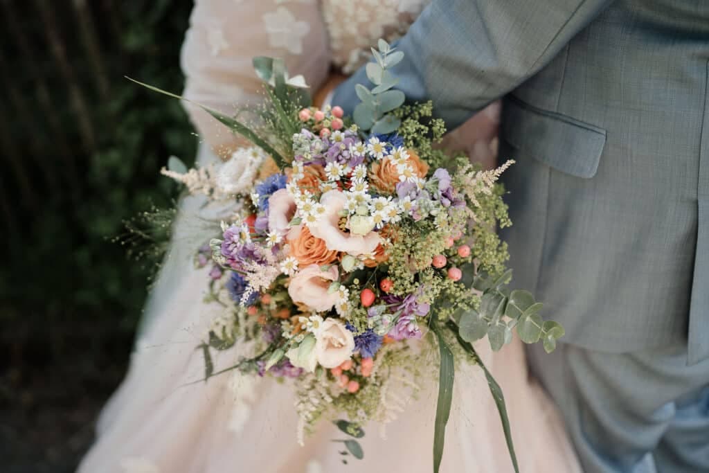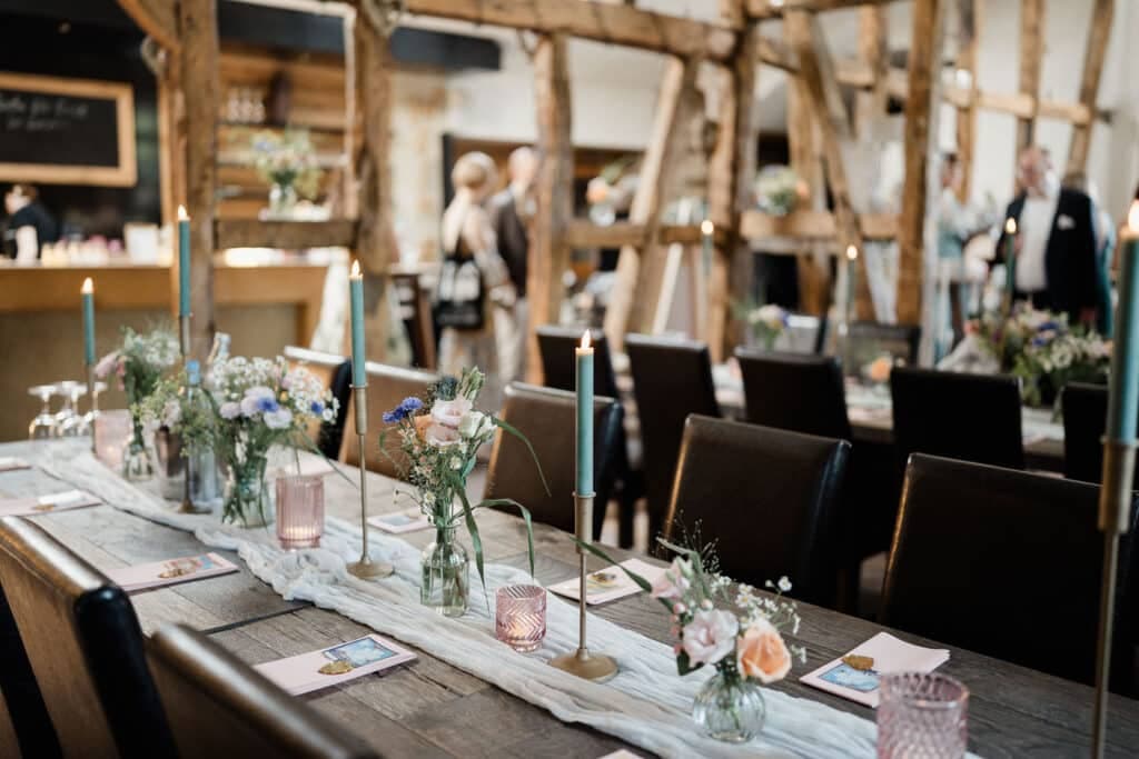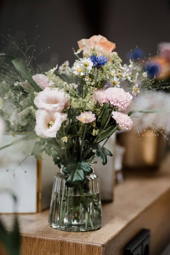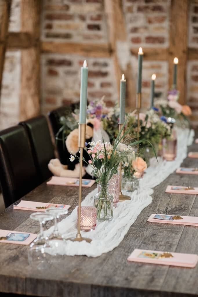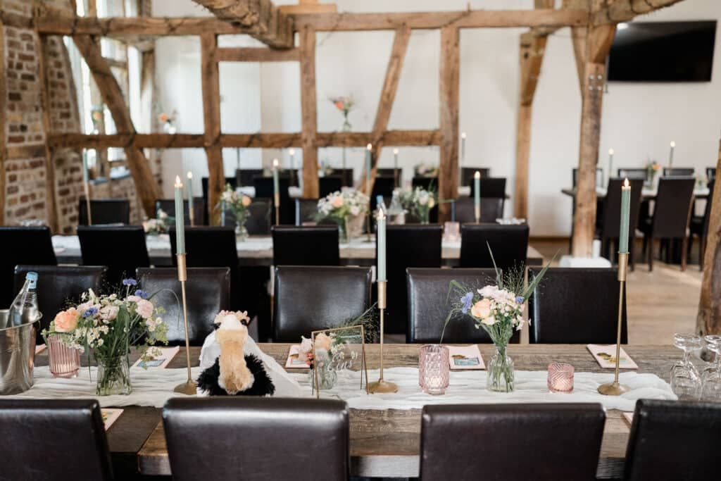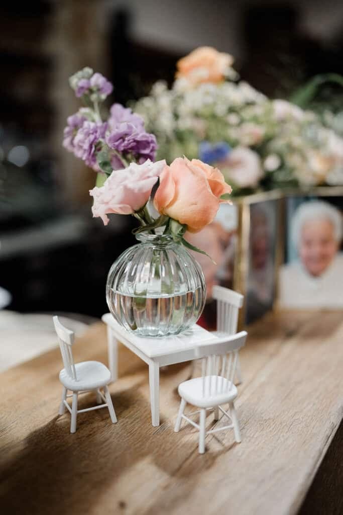 Leider gibt es auch Personen, die diesen besonderen Tag nicht mit Janina und Tim feiern konnten. Dem großen Wunsch, dass diese Personen dennoch mit dabei waren, sind wir von Herzen gerne nach gekommen und haben einen kleinen Tisch, Stühle und ein Väschen mit den wunderschönen bunten Blumen dekoriert. Diese liebevollen Details, die sich Janina überlegt hatte, zeigen wieviele wunderbare und zugleich traurige Emotionen Teil des Festes waren und dieses so persönlich gemacht haben.
