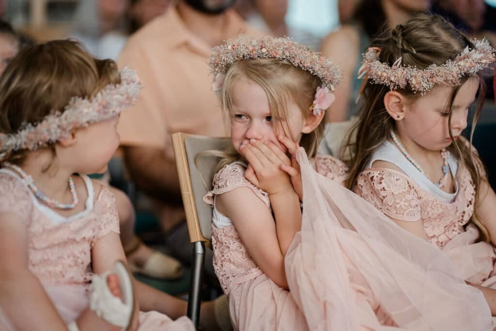 Für die Kids gab es während der Hochzeitsfeier nicht nur unsere kreative Kinderecke Kaspar, die mit Malstiften, Bastelzubehör und Malblöcken zum kreativen Gestalten einlud, sondern auch wunderschöne Trockenblumenkränze, die perfekt zu dem rosa-Pastelllook der Kleider passten.