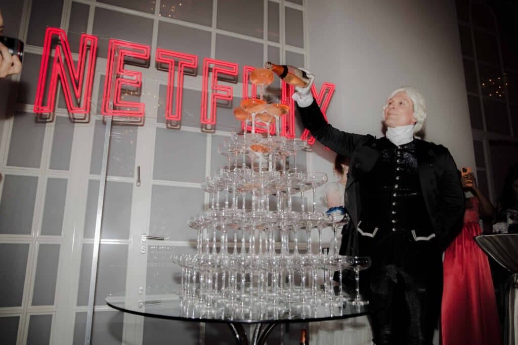 Ein Champagnertower, oft das Highlight schicker Partys, besteht aus gestapelten Gläsern, in die Champagner von oben eingegossen wird, sodass der sprudelnde Wein von oben in die unteren Gläser fließt. Dieses beeindruckende Spektakel strahlt Luxus und Eleganz aus – genau wie die Serie "Bridgerton".