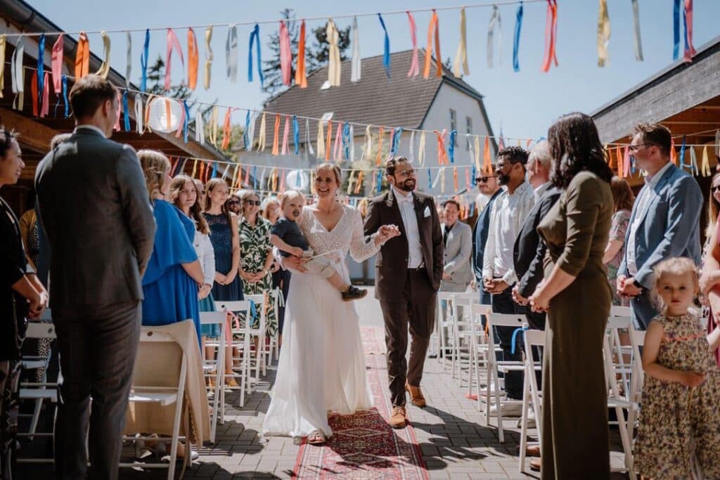 Eine Freie Trauung ist eine der schönsten und persönlichsten Arten, Ja zu sagen, denn eine solche Zeremonie lässt sich besonders individuell gestalten und bietet Raum für kreative und einzigartige Dekorationsideen. Ein Beispiel hierfür ist die Verwendung bunter Satingirlanden und Vintage Teppichen. Alles andere als klassisch und dennoch festlich und vor allem persönlich. Diese Elemente verleihen der Trauung nicht nur Farbe und Charme, sondern auch eine unverwechselbare Atmosphäre.