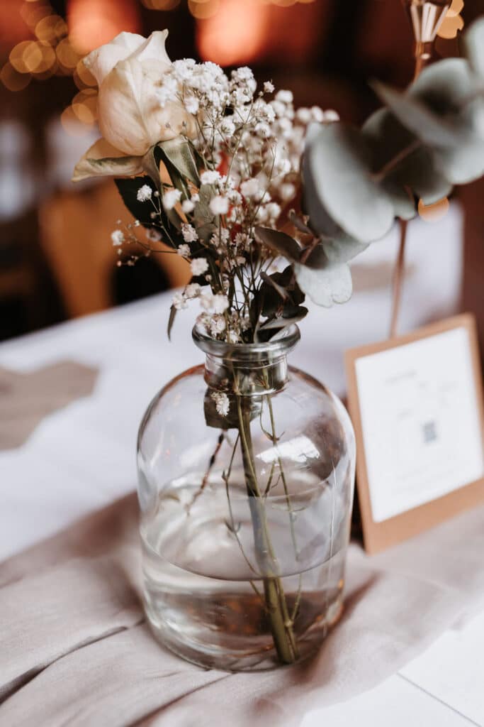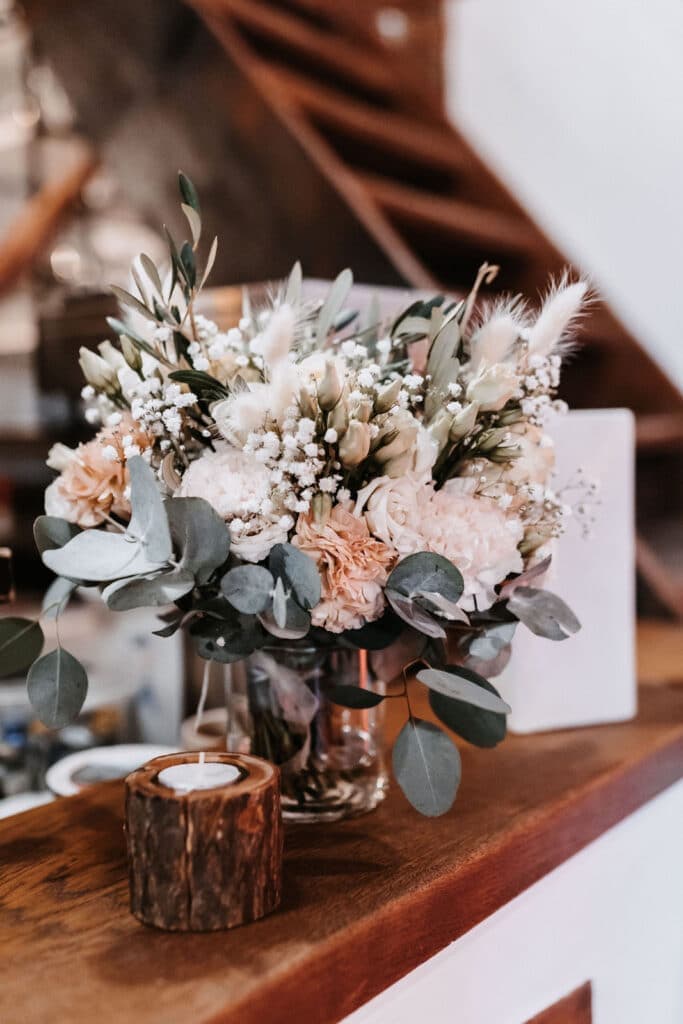 Vanessa und Torsten haben sich für die Dekoration ihrer Scheunenhochzeit für das Farbkonzept Roségold, Eucalyptus und Weiß entschieden. Diese Farbkombination wirkt elegant und dennoch natürlich und fügt sich harmonisch in die rustikale Umgebung der Scheune ein.