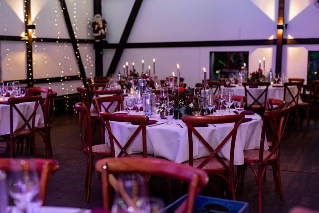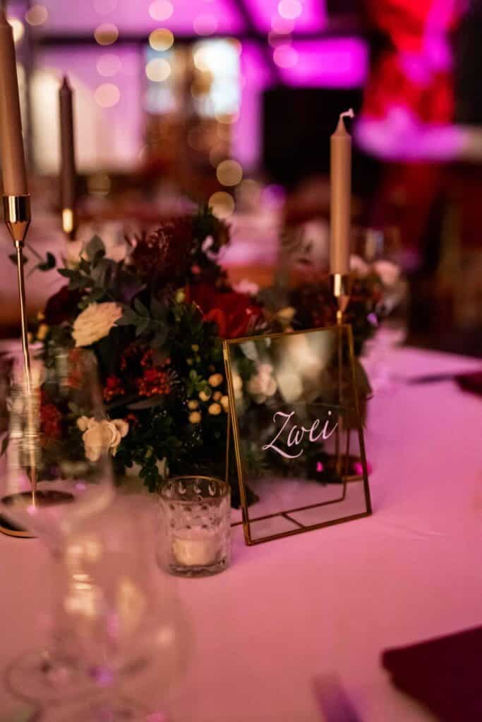 Die gemütliche Location verzauberten wir mit vielen feinen Lichterketten in eine funkelnde Hochzeitslocation. Rote Akzente in der Dekoration, die wir über Stoffservietten und die Floristik gezeigt haben, sorgten für eine romantische und zugleich warme Atmosphäre.