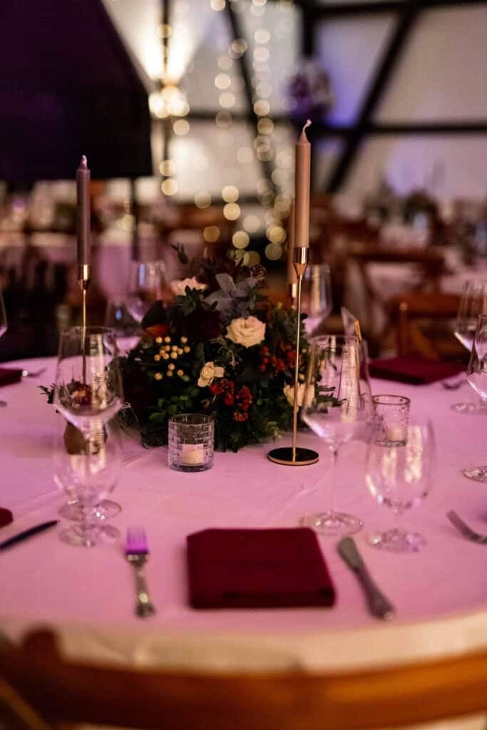 Auf den runden Tischen haben wir als Centerpiece ein florales Gesteck platziert. Rundherum fanden unsere Kerzenständer Karlie Platz, die Du - wie viele andere wunderschöne Lieblingsstücke - in unserem Mietkatalog findest. Ergänzt haben wir die Dekoration mit Windlichtern und kleineren Vasen. Wir lieben das Spiel von unterschiedlichen Höhen, dadurch wird die Tischdekoration lebendig.